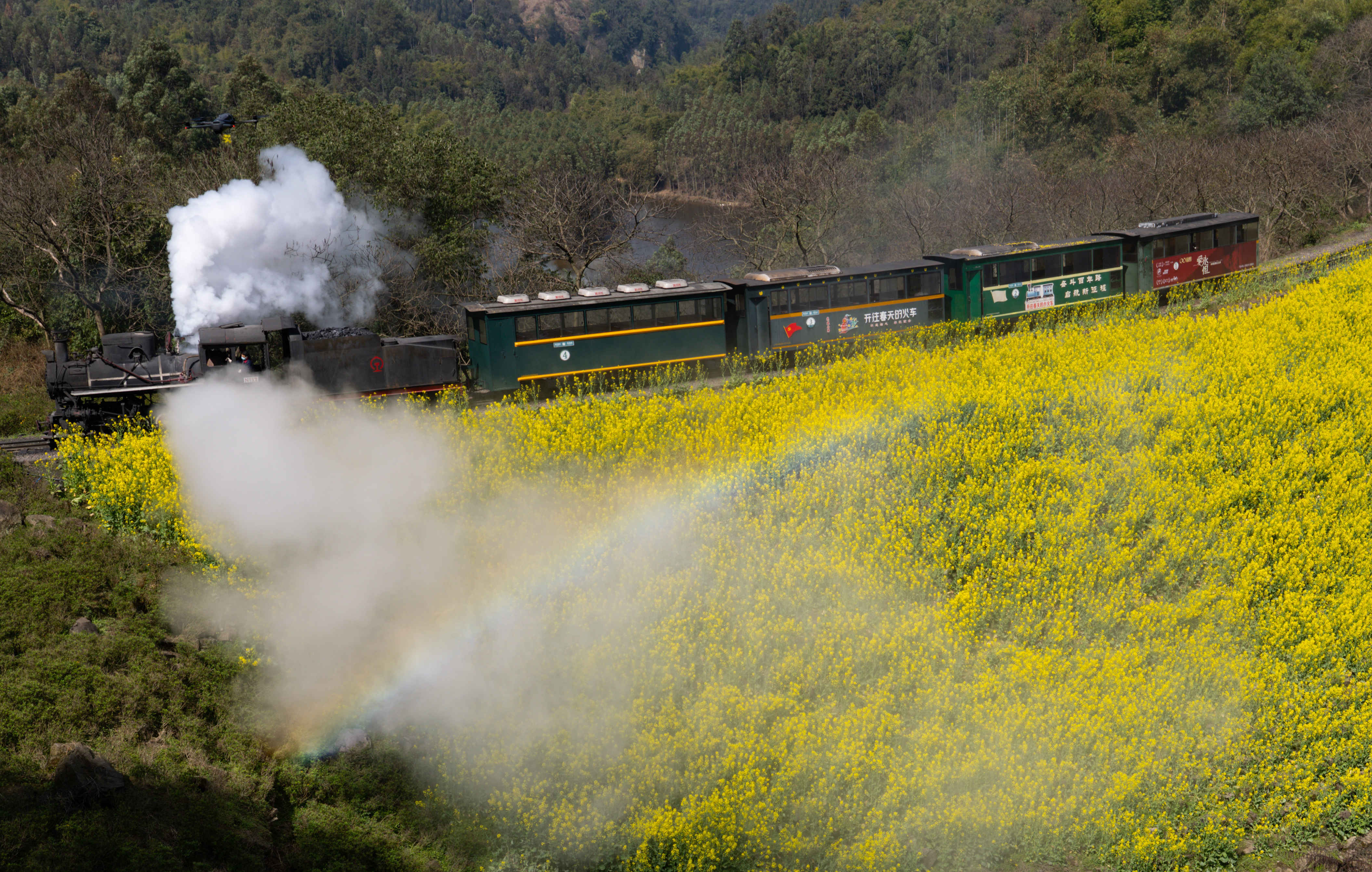 在四川省乐山市犍为县芭沟镇,小火车行驶在油菜花田中(3月4日摄)。