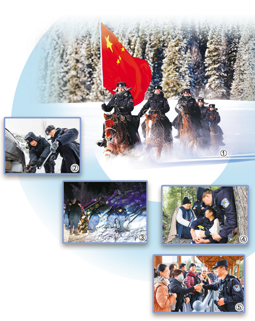 图①:喀纳斯边境派出所民警正在骑马执行巡逻任务。 本报记者 李亚楠摄 图②:喀纳斯边境派出所民(辅)警正在挂拖车钩。 王友波摄 图③:喀纳斯边境派出所民警和“喀湖" />